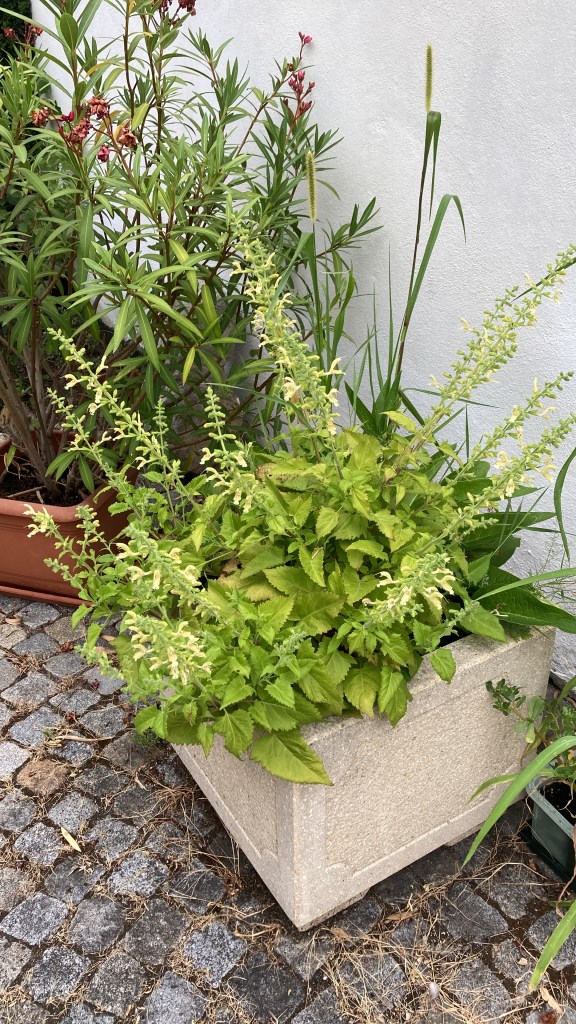 Wenn vieles schon verblüht und noch viel mehr vertrocknet ist (nach mehr als 2 Monaten heißem Sommer ohne nennenswerte Regenmenge), betritt der klebrige Salbei die Bühne. Er blüht im Hochsommer bis Ende September. Gerade hab ich ein paar Blüten abgezupft – ich hab ihn ja im Hof-, die dürfen jetzt trocknen und wandern noch in meinen Haustee, den ich übers Jahr hindurch Kraut für Kraut zusammengesammelt hab.