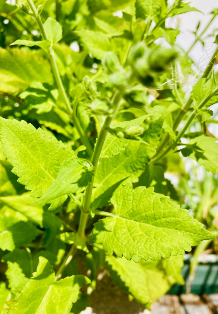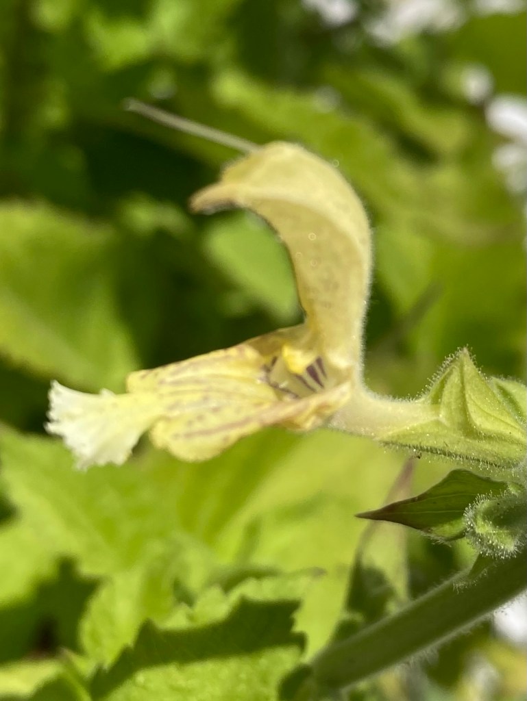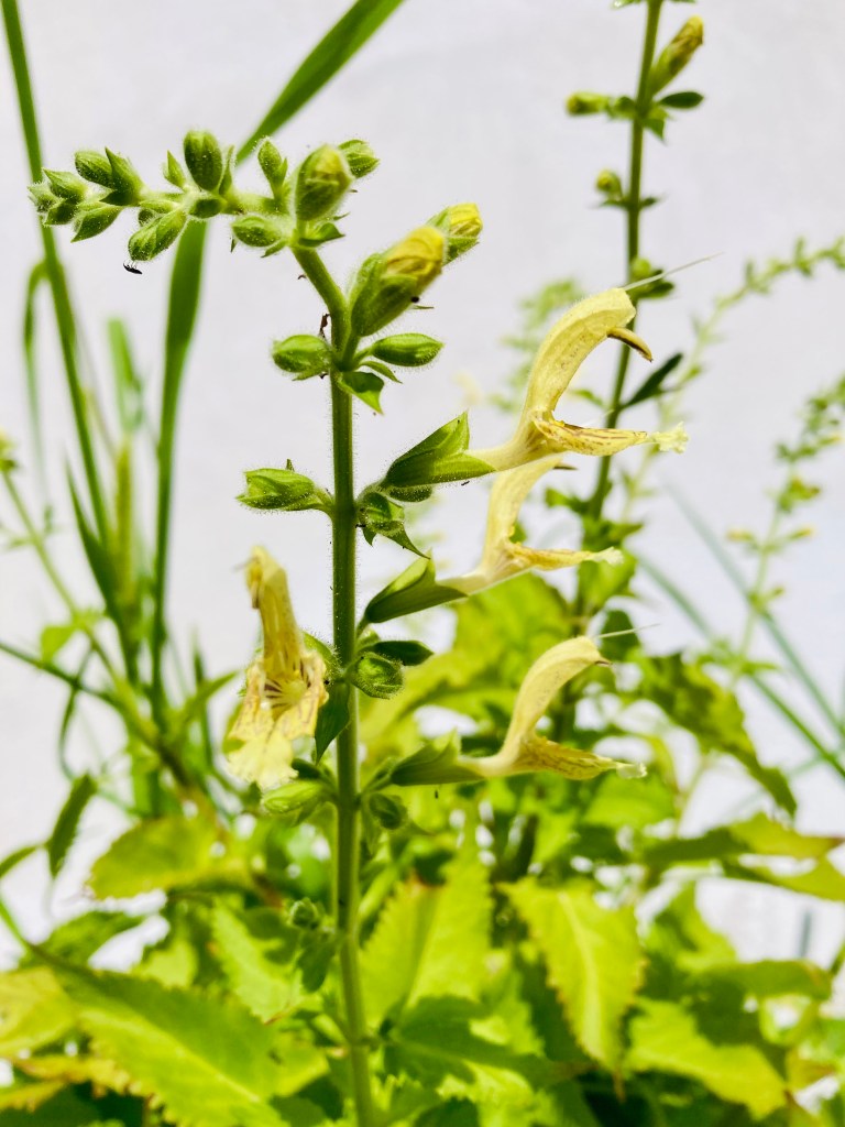 Der klebrige Salbei, wird auch gelber Salbei genannt, eine sommergrüne Staude, die 40-80 cm hoch wird, horstartig wachsend, ein Lippenblütler wie alle Salbeiarten. Laut Lehrbuch sind der vierkantige Stängel, die Laubblätter und Kelchblätter klebrig behaart – da war bei mir die Krux, denn mein Exemplar ist am Stängel bloß im Bereich der Blütenknospen bzw Blüten klebrig behaart, also nur an den oberen cm. Stängel und Laubblätter sind filzig behaart aber nicht klebrig. Vielleicht ein Unterschied dem Standort wegen im Topf im Hof und recht sonnig, ned wild am Waldrand.